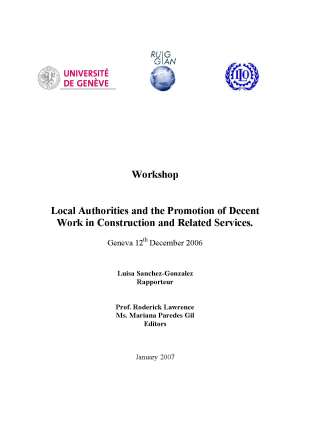 This report summarises the presentations and discussion during an International Workshop on «Local Authorities and the Promotion of Decent Work in Construction and Related Services » held at the International Labour Office (ILO) Headquarters in Geneva on 12th December 2006. The workshop is an integral component of an international applied research project financed by the Geneva International Academic Network (GIAN) and undertaken by a team at the University of Geneva and the International Labour Office with assistance from consultants. The programme and list of the workshop participants are included in Appendix A. Further information about this project can be obtained from Ms. Mariana Paredes at the University of Geneva: Mariana.Paredes@cueh.unige.ch. The project team invites comments and suggestions from interested persons and institutions.